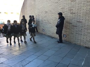 小学校の正門前には、毎朝校長先生が立っています。