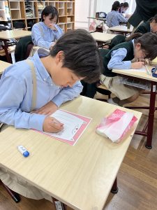 今回のたてわり活動では、6年生から5年生へとたてわり班リーダーの引き継ぎ式が行われました。3年生から5年生はあたたかく声をかけてまとめてくれた6年生に感謝のメッセージを書き、渡しました。学年でいろいろな活動を思い返しながら思いをまとめる作業は、教員が指示を出さなくてもどんどん進んでいきました。それだけ仲良くなって、絆が深いのでしょう。言葉がどんどん浮かんできて時間が足りないくらいでした。