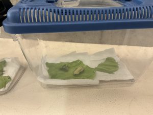 学級園のキャベツにはモンシロチョウの卵が産み付けられています。3年生はこの卵をそっと採集してお世話をしながら成長の様子を調べています。今日も児童が卵を探しつつ、餌にするキャベツを集めていました。