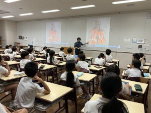 前出の5年生国語に続き、4年生は英語の授業を受けました。関西大学初等部の先生にご指導いただき、授業の冒頭では数字を使った自己紹介からスタート。テンポの良い進行と関西らしい軽快なノリに、子どもたちは自然と引き込まれ、積極的に参加していました。