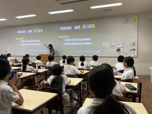 授業中の活動では、自分の好きな色や動物について「質問動画」を撮影し、それに合わせて答えるというユニークな取り組みに挑戦しました。質問動画を撮る際には、答えやすいように間を空けたり、相槌を入れたりと工夫が必要で、子どもたちは試行錯誤しながら楽しんで取り組んでいました。