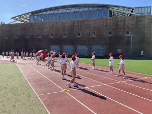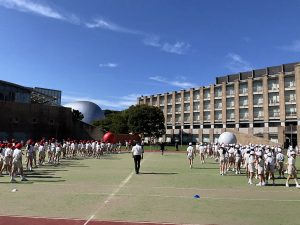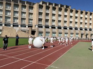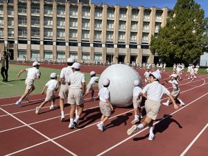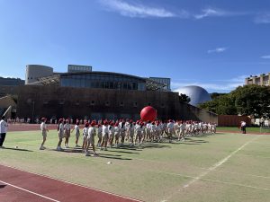 トラックいっぱいに、紅白の大玉が生き物のように移動します。運動会本番はどちらが先にゴールにたどり着くのでしょう。必見です!