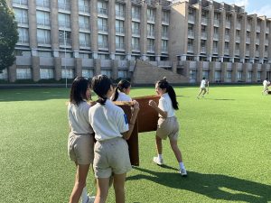 運動会前日は6年生が6時間目の時間を使ってグラウンドを整えたり、椅子を運んだりと前日準備に取り組みました。まずは走った時に滑らないようにほうきでグラウンドに出た砂を掃きました。声をかけられる前に滑りやすいカーブの部分を丁寧に掃く姿がみられました。重たい得点板は友だちと協力して運びました。椅子などの数が必要なものは何度も往復して運びました。てきぱきと動くことができたので、予定通りに作業を進めることができました。