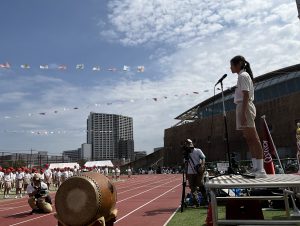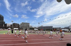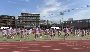 まずは演技種目。低学年は洗足学園音楽大学のアイドルグループ「MARUKADO」の曲に合わせてかわいいダンスを披露しました。そして、最後には「MARUKADO」本人が登場するサプライズもありました。中学年は真夏をイメージした楽曲に合わせて踊りました。運動会途中から顔を出した太陽に負けない、キラキラ、ギラギラの素敵なダンスでした。高学年は今まで運動会で踊ってきた様々なダンスを取り入れて踊りました。また、自分たちで曲を選び、振り付けも考えて立派に踊り切りました。