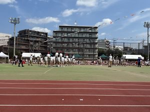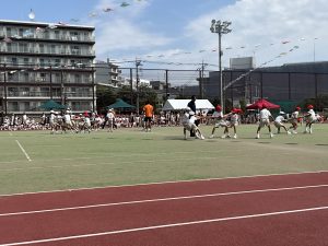 そして、やはり盛り上がるのが競技種目。低学年の玉入れはかわいい踊りと僅差の決着で盛り上がりました。中学年の棒引きでは、パワーとスピードの勝負で熱い戦いが繰り広げられました。高学年の騎馬戦ではチームワークを活かした頭脳戦が繰り広げられました。各種リレー競技ではチームで力を合わせてバトンをつなぎゴールを目指しました。