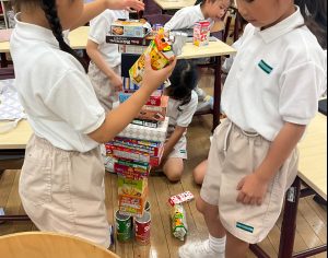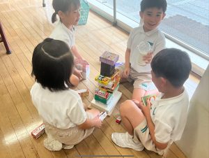 まずはじめに挑戦したのは、タワー作りです。家から持ってきた箱を友だちと持ち寄り、積み重ねながらできるだけ高いタワーを作りました。失敗を重ねていくうちに、子どもたちから自然と声掛けが始まります。