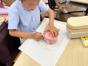 1年生が算数の授業でかたちの学習をしました。「かたちあそび」という単元名が、子どもたちにはとても魅力的に感じるようで、わくわくしながら取り組んでいました。