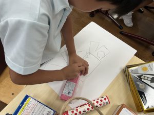 形の写し取りは、角度によって表情を変える箱を上手に使って、個性豊かな絵が出来上がりました。完成させた作品は、写真を皆で共有し展覧会のようにしています。