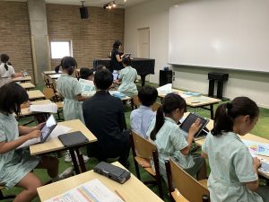 今日は、2名の保護者サポーターの方に、実際に児童の探究の様子を見ていただき、相談に乗っていただきました。今は主に調べる段階で、本やインターネットだけでなく、身近な友達の声を聞こうとアンケートを作る子もいました。探究の授業では、先生が課題を用意することはなく、ゴールもそこにたどり着くまでの道のりも自分で決めていかなければなりません。調べた結果、何が分かり、それをどうやって次の過程につなげるのか。点と点をつなげて線にしていくような作業の中で、保護者サポーターからのアドバイスは、子どもたちの探究の貴重な道しるべとなりました。これから、どうやって「問い」が深まっていくのか、とても楽しみです。