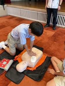 今日は6時間目の委員会活動で救命の講習を受けました。保健室の横にAEDがあることは知っていましたが、どのように使うのか全く分かりませんでした。AEDを使う前の心肺蘇生では、1分間に100〜120回圧迫部位を押しました。1秒間に2回も押さないといけないのでとても大変でした。もしもの時に役立ちたいです。