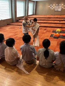 最後に、三角巾を使った応急処置の仕方を学びました。見ていると簡単そうに見えても、実際にやってみると三角巾の向きや結び方など、細かい部分まで気を配る必要があることを実感しました。