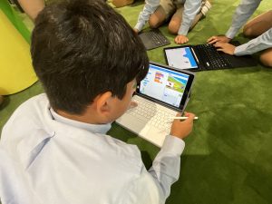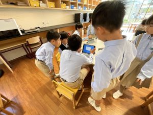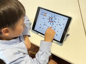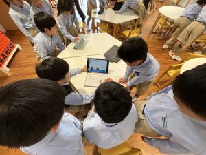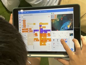 今年のICTクラブでは、2学期のメイン活動としてプログラミングソフトを使ったゲーム作りに挑戦しています。今回は、低学年の児童にも体験してもらうため、誰でも楽しめるような難易度でシューテイングゲームやバッティングゲーム、エスケープゲームなど1分程度で楽しめるミニゲームを部員全員が自分のiPadで作成しました。