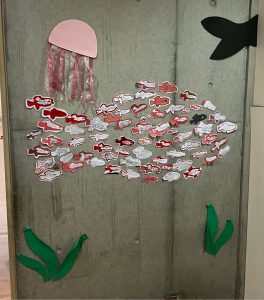 2年生の教室の前には、スイミーが楽しそうに泳いでいました。仲間の魚の体には、2年生の子たちのメッセージが書かれています。海の中の世界に想いを広げ、作られていました。