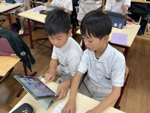 3年生では、読書の時間に「スピーチコンテスト」に向けての練習を積んでいます。クラス全員で同じ作品を読み、ペアを作って感想を発表し合い、いいところや残念だったところを伝え合いました。「面白い感想だね!」とにこにこ笑いながら発表を聞く子や、お友達と感想が同じだと気づいて「同じこと思ってたね!」と満足そうに話し合う子たちが見られ、とても楽しそうに活動している姿が印象的でした。