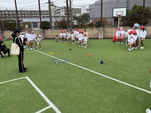 たてわりボッチャは中央のフラフープを狙ってボールを投げて、1番近くに寄せられたチームの勝ちとなります。このゲームはとても簡単なルールで誰でも楽しめるゲームです。
