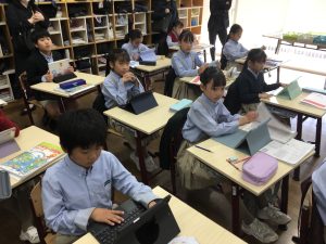 今日は、授業参観日でした。多くの保護者が見守る中でのクイズ大会は、いつにも増して気合が入ります。現在学習を進めている単元「日本のまわり」を範囲とした四択クイズ大会が始まりました。一問ごとに順位が入れ替わり、その結果に一喜一憂する子ども達。お家の人にいい所を見せようと素早く答えを入力した直後に、「あっ!」と苦い表情を見せる場面もあり、最後の一問まで順位が入れ替わる大混戦でした。おかげで教室内は大盛り上がり。