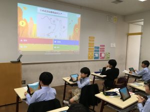 子ども達のiPad内には様々なアプリケーションがありますが、その中でも人気の高いアプリの一つが、「Kahoot!」です。全員参加型のクイズ大会ができるアプリで、正解数と解答までの速さで順位を競うことができます。3年生の社会科では日常的にクイズ大会を授業の中に取り入れています。