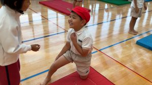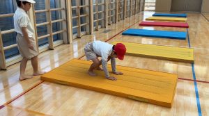 ネーミングこそ「転がり侍」ではありますが、横の回転の「鉛筆転がり」や「前転がり」、足の裏と裏を合わせて転がる「だるま転がり」だけでなく、逆立ちをして足の裏を合わせる「カエルの足打ち」やマットの真ん中に手をついて、左右にジャンプする「川とび」、「ブリッジ」など色々な技に取り組んでいます。