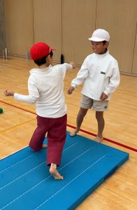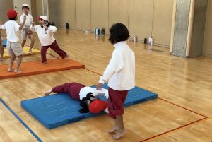 今、1・2年生の体育の授業ではマット遊びの単元で、立派な「転がり侍」になるため修行を積んでいます。相手の転がる技を上手に真似をすることができると「お主、なかなかやるな!」と相手に認めてもらえます。