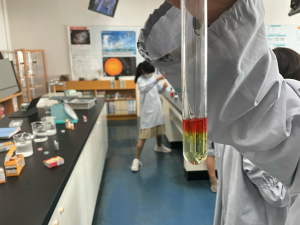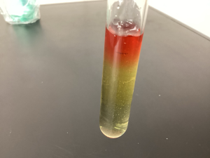この単元の最後の実験として、濃度の違う食塩水を作り、重さの違いを確認する実験をしました。濃度の違う食塩水を2つ作り、食紅で色をつけて、試験管にそっと流しいれました。どちらも食塩が溶け切っているので透明で、色をつけないと違いがわかりません。密度の違いで重さが変わることが2層になることではっきり分かりました。