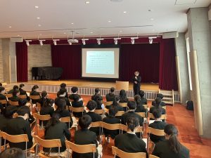 今回は、国連に公認・登録された国際NGOである、AAR JAPAN[難民を助ける会]様から、難民支援、地雷・不発弾対策をテーマに講演をいただきました。日本生まれの国際NGOで、紛争や災害、貧困などで困難な状況にある人々(難民、障がい者など)に対し、緊急支援から長期的な自立支援まで、政治・思想・宗教に中立な立場で人道支援活動を行っていること、日本を含む世界中で「難民支援」「災害支援」「障がい者支援」「地雷・不発弾対策」「感染症対策」「提言」の6分野で活動し、人々の尊厳と共生できる社会を目指していることなどを伺いました。シリア難民支援(トルコ)、パキスタン、カンボジア等の海外事業支援及び国際理解教育を担当された石原先生のお話には、「国際協力って誰が何をしているのか?」「難民支援について」などのお話をクイズを交えながら詳しくお話いただき、1学期に学んだ知識をより深堀りする機会となりました。