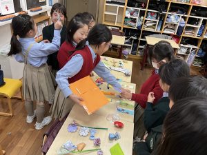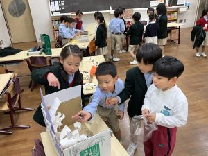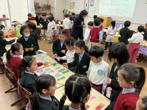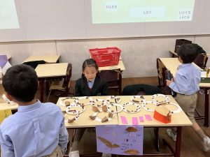 本番は、お店の係とお客さんに分かれて、A組B組が一緒になって楽しみました。途中ではスペシャルなお客様として附属幼稚園の年中さんにも参加してもらいました。1年生が年中さんとペアになり、一緒にお店を回りました。久しぶりにお兄さんお姉さんになって、案内やお店屋さんをしている1年生が頼もしくも見えました。