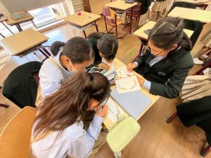メッセージは人それぞれですが、「これプレッシャーにならないかな?」「がんばれって書きすぎない方がいい?」と学年を超えて相談しながら言葉を考えていました。小さな折り鶴を入れてみたり、渡す6年生の好きな色を思い出しながらデザインを決めたり・・・