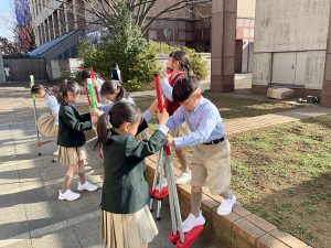昼休みには、1年生に優しく声をかけながら教える姿が見られました。1年生の上達の早さに驚いたり、一緒にできた喜びを感じたりと、学年を越えた交流が生まれています。昔遊びを通して、伝える力や思いやり、友だちと関わる楽しさを学ぶ貴重な時間となっています。