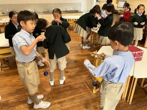 生活科の学習で、こまやけん玉、竹馬などの昔遊び体験に取り組んでいます。