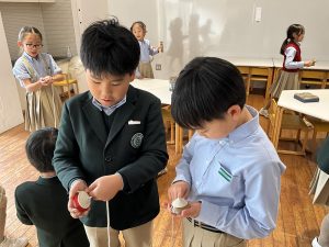2年生は、ただ遊びを楽しむだけでなく、「昔遊び名人」になり、1年生に遊びのコツや楽しさを伝えることを目標に活動しています。扱う遊びは、こま・けん玉・竹馬・お手玉・あやとり・めんこ・竹とんぼ・羽子板の8種類です。まずはすべての遊びを体験し、その中から自分が名人を目指したい遊びを選びました。名人の基準は、難しい技ができることだけでなく、遊びを楽しみ、その魅力を相手に伝えられることも大切にしています。