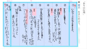 本校が扱う教科書には、「ありの行列」という1970年代から長年掲載されている説明文があります。文章が、はじめ・なか・終わりの3部構成に分かれているので、文全体の構造を捉えたり段落の学習をしたりするのに定番の教材です。