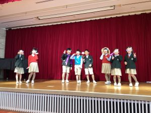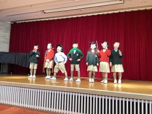 子どもたちはそれぞれ手作りの仮面を身につけ、広間のステージに上がり、思い思いのポーズを披露しました。この日は授業参観期間中でもあり、マスクに加えてワンアイテムを身につけ、かわいらしく着飾った子どもたちの姿を、保護者の皆様にもご覧いただくことができました。