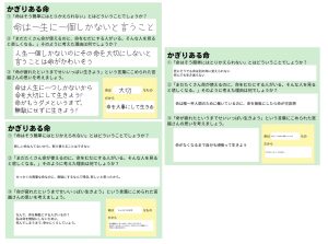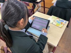 授業の初めの問いかけに、自信を持って「はい」という返事が返ってきました。理由を聞いてみると、夢に向かって努力しているから、好きなことを一生懸命に極めようとしているからなど、様々な理由を堂々と発表してくれます。そんな子ども達にとって、宮越由貴奈さんの詩「いのち」に込められた精一杯生きる覚悟、前向きな姿勢は、大きく共感できる思いだったのでしょう。シンプルな、飾らない言葉で綴られた言葉の一つ一つを自分に置き換えて考え、感じたことを共有していきます。普段は笑顔の絶えない活気あるクラスですが、この時ばかりは皆真剣な表情で、相手の意見に耳を傾けていました。