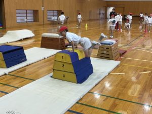 例えば、跳び箱の上に乗ってバランスを取ったり、またいで渡ったり、低い段を使ってリズムよく跳び越えたりと、子どもたちはさまざまな動きに挑戦します。両手で支える、体をひねる、素早く方向を変えるなど、全身を使った運動を通して、自然と体の使い方を身につけていきます。「できた!」「もう一回やりたい!」という声が体育館に広がる時間です。