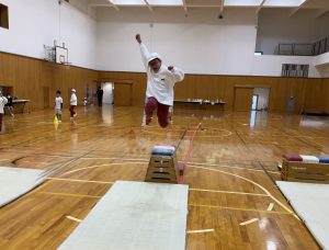 また、安全面への配慮も大切にしています。本校では、いきなり跳び越す練習は行いません。まずはマットの上で、両足でしっかり着地する練習から始めます。ひざを軽く曲げ、バランスよく止まる感覚を身に付けることで、安心して次の動きへと進むことができます。安全な着地ができることは、すべての運動の土台です。段階を踏んで練習することで、子どもたちは自信をもって活動に取り組めるようになります。