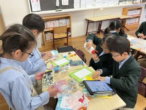 たてわり活動の一環として、1年生が6年生の似顔絵を描き、そのフレームを2年生が心を込めて作成しました。日頃から優しく接してくれている6年生の顔を思い浮かべながら、1年生は目や口の形、髪型などの特徴を丁寧に表現しようと一生懸命取り組みました。2年生は、6年生との関わりを思い出し、「サッカーが好きだったよね」「このキャラクターのお弁当箱を使っていたよ」と話し合いながら、その人らしさが伝わる飾りを工夫して仕上げました。飾りには、好きな色や得意なことをイメージしたモチーフを取り入れ、一つひとつが世界に一つだけの特別な作品となりました。