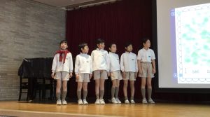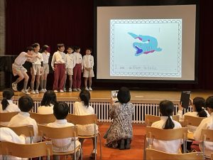 4年生は、インタビュー形式かお買い物のシチュエーションの英語劇をチームごとに選び、取り組みました。設定を工夫したり、話のオチを考えたりしながら、「英語ではどのように表現するのか」をネイティブの先生に相談する姿も見られました。準備期間が限られている中でも、小道具を用意するなど、聞いている人に内容が伝わるよう工夫して発表しました。