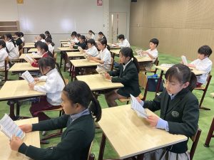 音楽室では、「花は咲く」の優しい歌声が響いていました。「花は咲く」は、2011年3月11日に発生した東日本大震災の復興支援を目的として、NHKが推進する震災プロジェクトの一環で制作されたチャリティーソングです。当時を知らない子ども達ですが、歌詞にじっくりと目を向け、鎮魂と再生のメッセージを感じ取りながら、思いを込めて歌っています。歌詞にある「いつか生まれる君に」という言葉の通り、未来を担う子ども達が希望の光となり、こうして立派に成長している姿に胸が熱くなります。