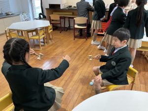 生活科の学習で、こまやけん玉、竹馬などの昔遊び体験に取り組んでいます。